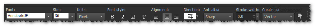 32. From Tool bar, select the Text tool. Find AnnabelleJF and set the size to 36, Line style at Solid. Kerning 25, all other settings at default.