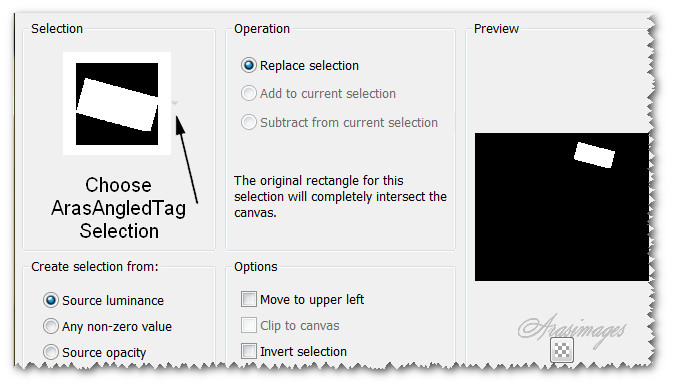 19. Selections/Load/Save Selection/Load Selection from Disk. From the drop down arrow, choose ArasAngledTag Selection. Load.