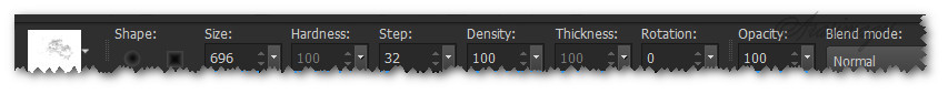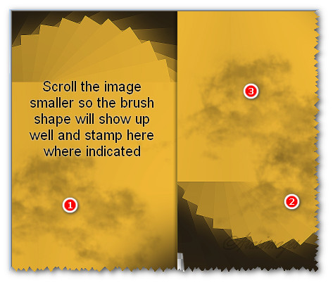 14. From Tool bar select the Paint brush tool. Find fog131 brush. Leave at default settings. Using Background color #1f1913, stamp as seen below. HINT: If you scroll the image smaller and hover the mouse over the image, the brush outline will show so you can more accurately stamp the image.