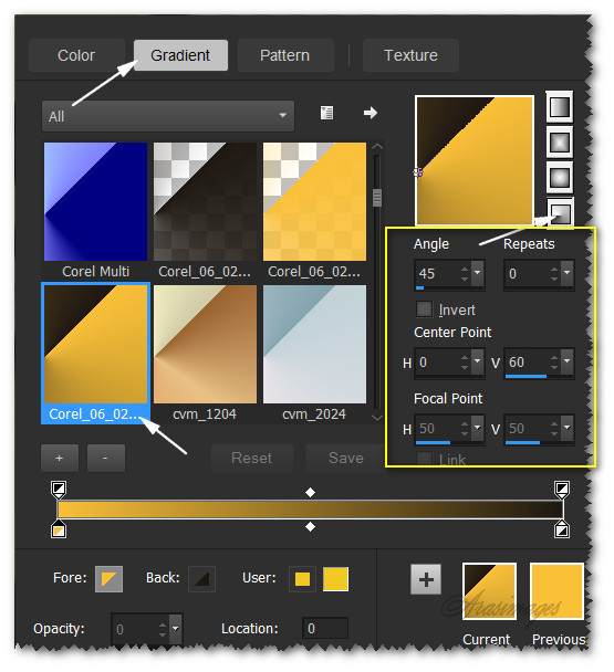 2. Create a Gradient using Foreground/Background colors, Corel_06_29 foreground/background gradient, Style Radial, Angle 45, Repeats 0, Invert unchecked, Center Point H 0, V 60, Focal Points grayed out.