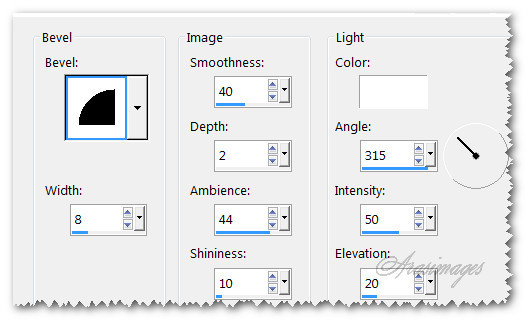 21. Effects/Alien Skin Eye Candy 5: Impact/Bevel. Under Lighting tab, select Highlight Color from your Foreground color. Choose the ArasimagesBevel under Settings Tab. Click OK.