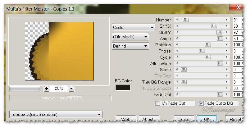 Unzip the materials into a working folder you have created on your desktop named African Zebra. Please duplicate and close original tubes. Use the copies for your work so you will not lose the originals. Export the fog and grass brushes into your PSP/Brushes folder. Place ArasAngledTag Selection in your PSP/Selections folder. Click on the ArasimagesBevel.f1s file to install it into Alien Skin Eye Candy 5:Impact/Bevel. I have used the plugins Mura'sMeister/Copies, AAA Frames/Texture, VM Toolbox/MirrororriM and the Alien Skin Eye Candy 5: Impact/Bevel in this tutorial. It is assumed you have a working knowledge of PSP to follow these directions. I have used PSPX7 for this tutorial but other versions may be used. To work this tutorial, it is assumed you have some working knowledge of Paint Shop Pro.