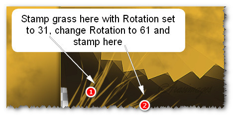 39. Using the color #f9c039, right click in bottom right corner so grass bottom is not showing, stamping grass once. Change Rotation to 61 and stamp again with grass lower and to the right. See example below.
