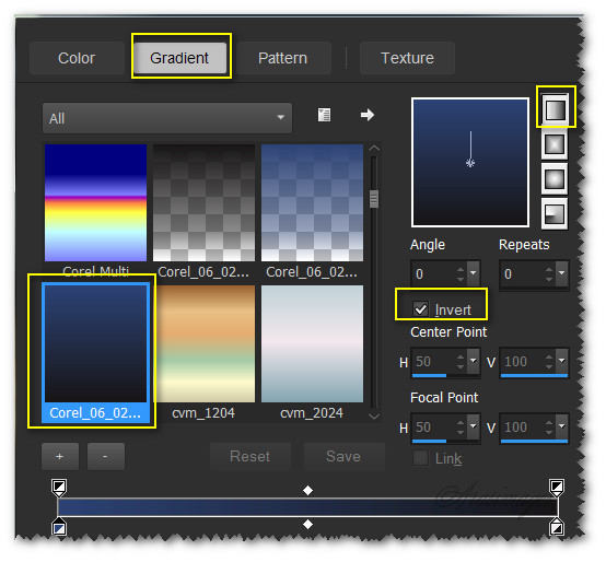 1. In Materials Palette, set Foreground to #2d4375, Background to #181617. Create a Gradient using these colors, Gradient Corel_06_029 (foreground/background), Style Linear, Angle 0, Repeats 0, Invert checked, Center Points/Focal Points grayed out.
