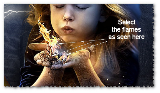 3. Scroll the image to 150% for easier selecting. Using Selections tool/Freehand Selection set Point to Point, Add(Shift), Feather 0, Anti-alias checked, select around the portion of the flames in little girl's hands which you want to animate.