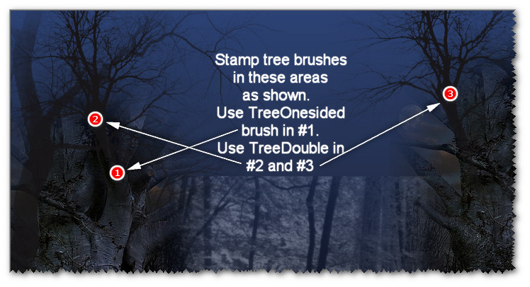 12. Using the Paint Brush tool again, select Brush TreeDouble. Use settings below and stamp twice where indicated with same color as last step.
