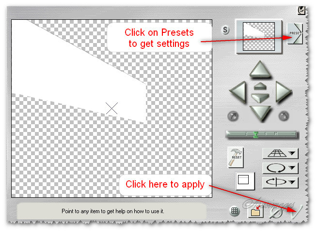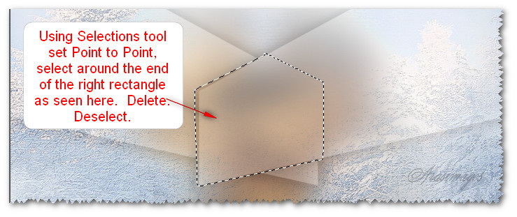17. Highlight Raster 3 (first angled rectangle on left). Selections/Freehand Selection/Point to Point, all other settings at default, select around the end of the left rectangle as seen below and press Delete key. Deselect.