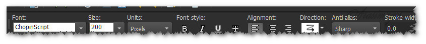 46. From Text tool, select the font ChopinScript, Size 200px, Stroke width 0.0, Line style solid, type the letter "S". Change the size to 100 px. Type the rest of the word "oftness". Space and type the word "of". Space. Change the size to 200px and type the letter "W". Change the size back to 100 and type out the rest of the word "inter". Convert to Raster Layer.