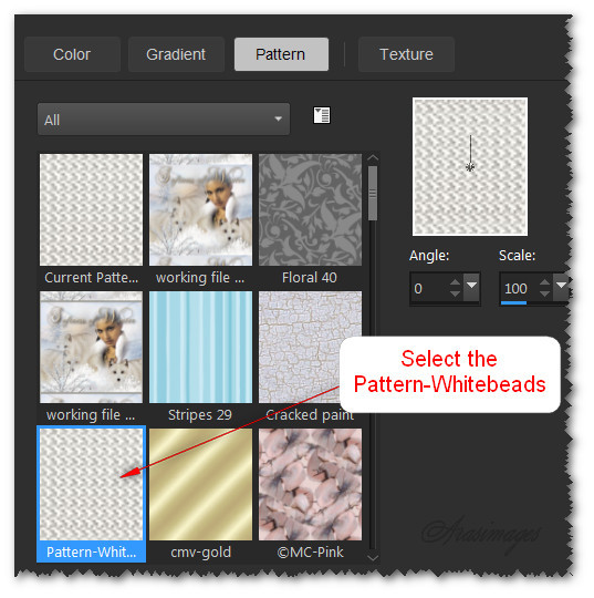 56. Open Pattern-Whitebeads on your desktop. Go to the Materials Palette, select Pattern tab and choose Pattern-Whitebeads so it shows in the Foreground.