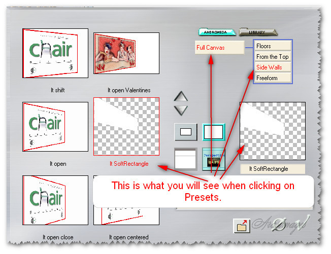 Unzip the materials into a working folder you have created on your desktop named Softness of Winter. Please duplicate and close original tubes. Use the copies for your work so you will not lose the originals. Place the Andromeda Preset in the Perspective-Presets/andromeda/02Full Canvas/22Side Walls folder. Place the Selection in your PSP/Selections folder. I have used the plugins Andromeda/Perspective, Filters Unlimited/Buttons & Frames/3D Glass Frame and Creativity/Splatter in this tutorial. It is assumed you have a working knowledge of PSP to follow these directions. I have used PSPX8 for this tutorial but other versions may be used. To work this tutorial, it is assumed you have some working knowledge of Paint Shop Pro.