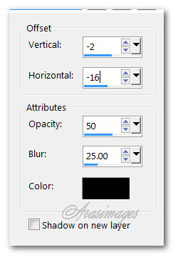 30. Effects/3D Effects/Drop Shadow. Vertical -02, Horizontal -16, Opacity 50, Blur 25, color #000000.