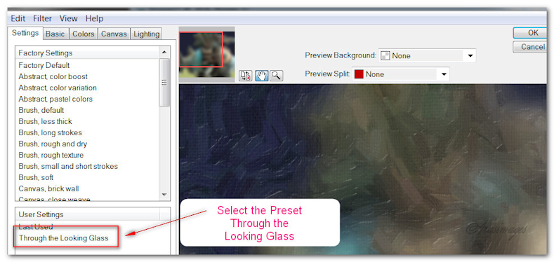 Unzip the materials into a working folder you have created on your desktop named Through the Looking Glasses. Please duplicate and close original tubes. Use the copies for your work so you will not lose the originals. Place the Preset in the Alien Skin Snap Art/Settings/Paint folder. Place the Selection in your PSP/Selections folder. Place the Narah Mask in your PSP/Masks folder. Place the Steffi14.jpg in to your PSP/Patterns folder. I have used the plugin Alien Skin Snap Art/Oil Paint and Simple/Top Left Mirror in this tutorial. It is assumed you have a working knowledge of PSP to follow these directions. I have used PSPX8 for this tutorial but other versions may be used. To work this tutorial, it is assumed you have some working knowledge of Paint Shop Pro.