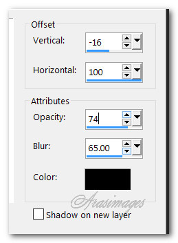 23. Effects/3D Effects/Drop Shadow. Vertical -16, Horizontal 100, Opacity 74, Blur 65, color #000000.