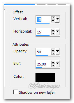 18. Effects/3D Effects/Drop Shadow. Vertical 15, Horizontal 15, Opacity 50, Blur 25, color #000000.