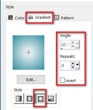 1. In Materials Palette, set Foreground to #fefaf7, Background to #308da1. Create a Gradient using Corel_06_029 (Foreground/Background), Style Sunburst, Repeats 0. Invert unchecked. Center Points/Focal Points all at 50.