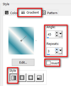 31. In Materials Palette, change Gradient to Style Linear, Angle 45/Repeats 3, Invert unchecked.