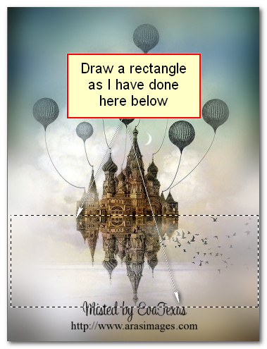 21. Using the Selections tool set to Rectangle, Add(Shift), Feather 0, draw a rectangle from center of castle to below the reflection of the top as seen below.