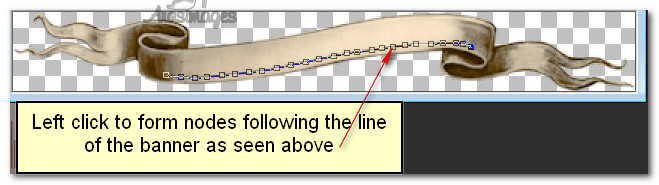 66. Close off bottom box in Materials Palette. Change foreground color to #000000. Using the Pen tool from the tool bar, Line style solid, Width 1.00, Anti-alias checked and using settings below, click a row of nodes keeping in line with the curvature of the banner. Apply.