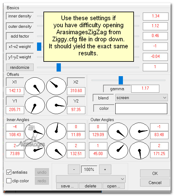 43. Effects/Dragonfly/Sinedots II/Ziggys.cfg/ArasimagesZigZag. Click Open button and find the Ziggys.cfg. Click on it and then click the dropdown arrow and select ArasimagesZigZag preset. Click OK. Or if you have difficulty, use the settings as seen below to achieve the same results.