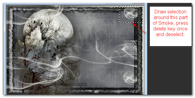 27. Using Selection Tool set to Rectangle, select around smoke on top right corner, press Delete key once. Deselect.