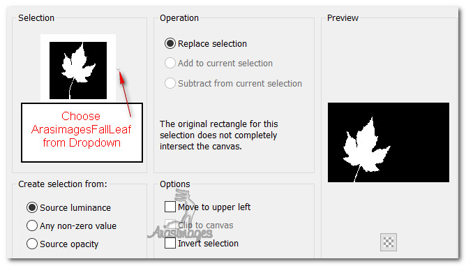 18. Selections/Load/Save Selection/Load Selection from Disk. Find ArasimagesFallLeaf/Load.
