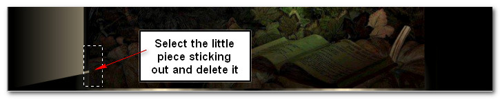 15. Using the Selections tool set to Rectangle, Add (Shift), Feather 0, select around the little piece sticking out on bottom left side as seen in example below. Press Delete Key once. Selections/Select None.