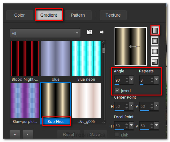 1. In Materials Palette, select the Boo Hiss Gradient provided and place in Foreground. Background set to #000000. Set Boo Hiss Gradient as seen below.