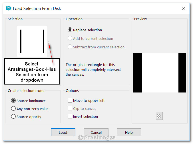 5. Selections/Load/Save Selection/Load Selection from Disk. Choose Arasimages-Boo-Hiss selection. Load.