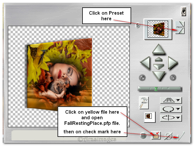 43. Effects/Andromeda/Perspective. Click on Presets at the top right, then on the yellow envelope at the bottom right. Once it opens to the Presets, choose the FallRestingPlace.psp file. Click on the check mark at the bottom right. When the next box appears showing the image in a perspective shape, click the check mark again.