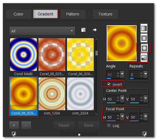 1. In Materials Palette, set Foreground color to #f9d800/Background color to #b13a09. Create a Gradient using the Foreground/Background colors, Style to Sunburst, Angle null/Repeats 3. Invert checked. Center Point/Focal Point all set to 50.
