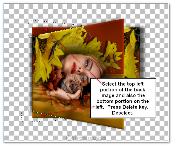 45. Drop down to the Merged layer and highlight it. Using your Selections tool set to Freehand Selection, Point to Point, Mode: (Add Shift), Feather 0, select around the top and bottom left that is showing and press delete key once to eliminate them. Selections/Select None.