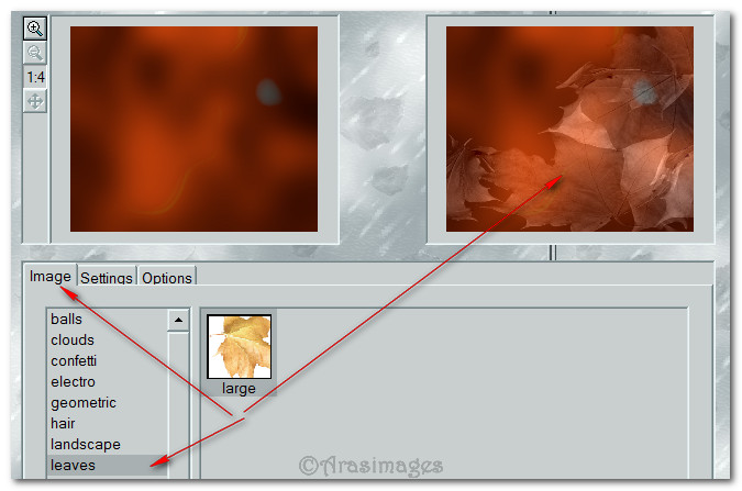 9. Effects/Creativity/Splatter. Try to set your settings as I have mine although I got different results each time I tried it. Adjust settings to get leaves that please you.