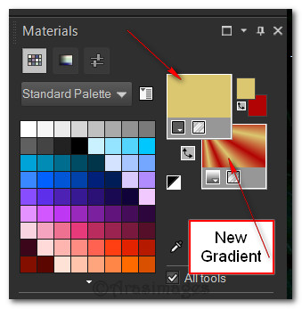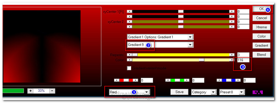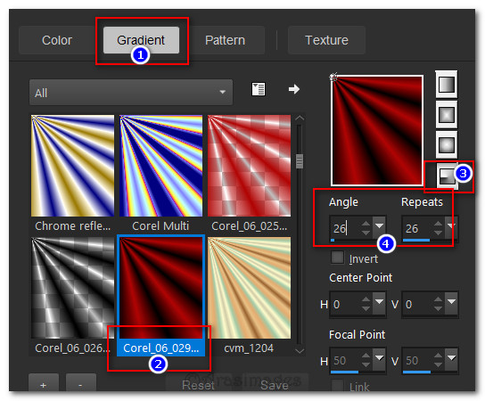 1. In Materials Palette, set Foreground to #000000, Background to #b10505. Create a Gradient in background using these colors, Gradient Corel_06_029 (foreground/background), Style Radial, Angle 26, Repeats 26, Invert unchecked, Center Points H 0/V 0, Focal Points H 50, V 50 but grayed out.