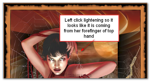 44. Close off top layer. Go down one layer, open and highlight it. Set the Size to 142, Rotation to 128 and double click three times at the end of her middle finger of lower hand. Close off layer.
