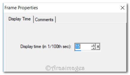 58. From top tool bar, click on Animation/Frame Properties. Set the Display time to 15. (The higher the number the slower the animation).