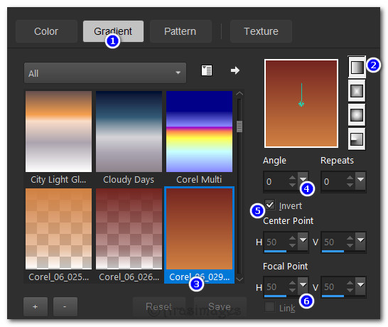 1. In Materials Palette, set Foreground to #691813, Background to #cc7636. Gradient/Corel_06_029 (Foreground/Background). Set the Style to Linear, Angle/Repeats 0, Center Points and Focal Points are null, Invert checked.