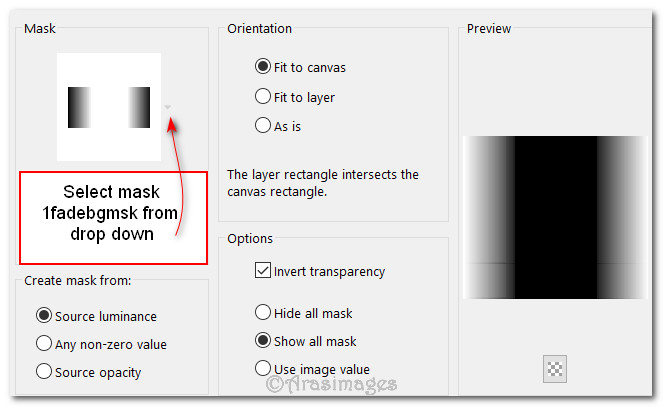 8. Layers/Load/Save Mask/Load Mask from Disk. Select Mask 1fadebgmsk from drop down. Load.
