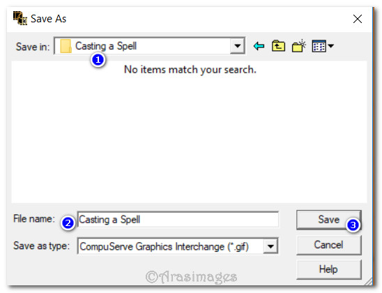 60. File/Save As. When the Save As box appears, direct where to save (Working folder is a good choice), give your file a name, leave Save as Type as is (*gif) and click Save.