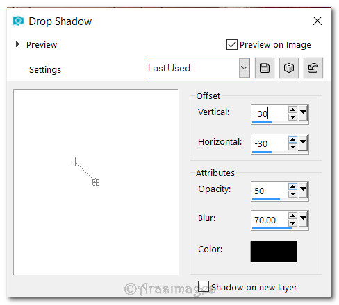 25. Effects/3D Effects/Drop Shadow. Vertical -30, Horizontal -30, Opacity 50, Blur 70, color #000000.