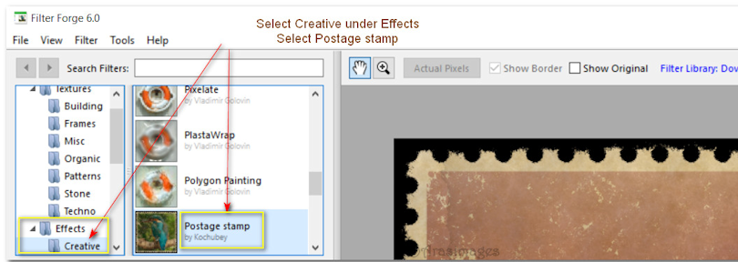 8. Effects/Filter Forge/Filter Forge 6. Use settings Effects/Creative and Postage Stamp.