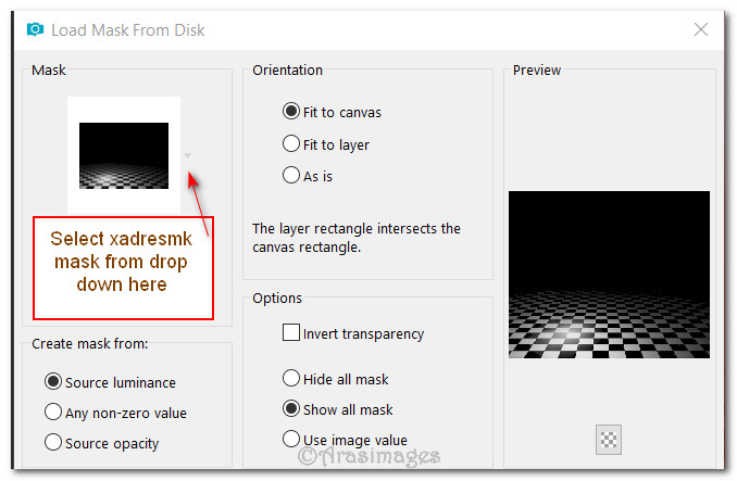 6. Layers/Load/Save Mask. Load Mask from Disk. Select Mask xadresmk from drop down. Load.