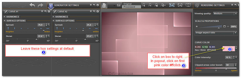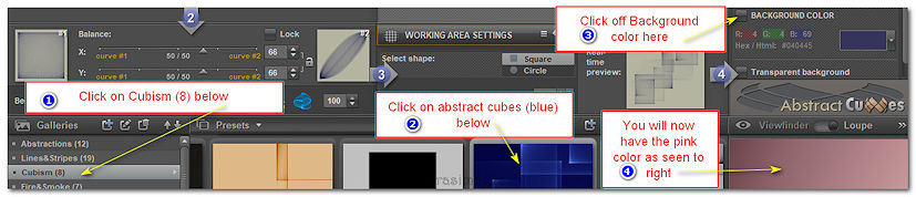 3. Effects/AbstractCurves. Leave numbers 1, 2 and 3 as default. On the right under Curve Color, click on the color rectangle. A box will pop out and click on the top left color. This will place #FFC0CB in the color box. Drop down to Backgrond color and make sure it is unchecked. Make sure Transparent background is unchecked under #4. At the bottom left choose Cubism (8). Use the arrows to find abstract cubes (blue) in bottom tray. The color in the box at the right should now be pink. Click OK. See the two snapshots below to show you where to click. Hint: To better view the examples below, scroll your page larger.