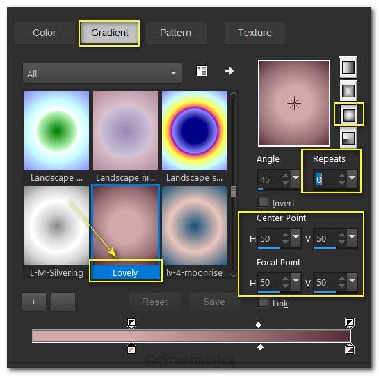 1. In Materials Palette, set Foreground to #cea2a4, Background to #49212b. Set the Gradient to the following settings using Gradient Lovely: Sunburst, Angle null/Repeats 0. Invert unchecked. Center and Focal Points H 50/V 50.