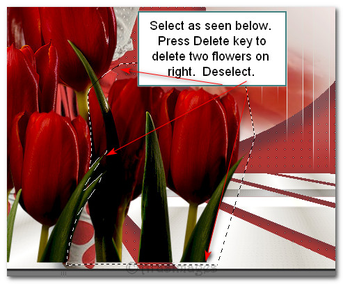 34. Scroll image larger so it will be easier to work with. Select Free Hand selection tool using settings below. Left click to draw around the tulips on the right, right click to connect the selection line. Press Delete key once to delete. Deselect.