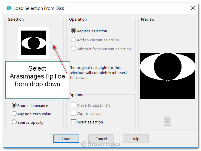 5. Selections/Load/Save Selection/Load Selection from Disk. Load.
