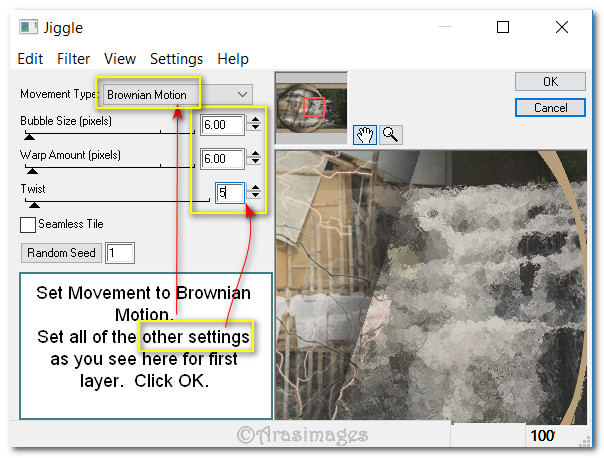 35. Effects/Eye Candy 4000/Jiggle. Set the Motion setting to Brownian Motion, all other settings as seen below. Click OK. Close off layer.