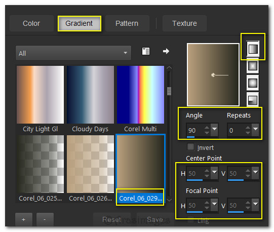 1. In Materials Palette, set Foreground to #b29773, Background to #1b1c12. Create a Gradient using Corel_06_029_foreground/background,Linear, Angle 90/Repeats 0/Invert Null, Center Point/Focal Point all null.