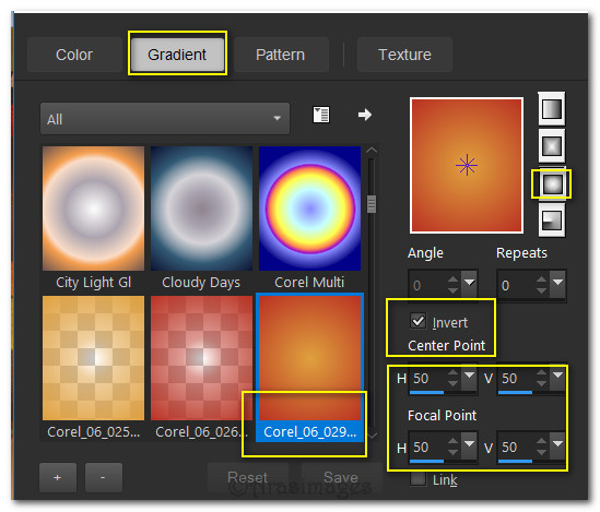 1. In Materials Palette, set Foreground to #b32516, Background to #dc9832. Create a Gradient using Corel_06_029_foreground/background, Sunburst, Angle Null/Repeats Null/Invert checked, Center Point/Focal Point all set to 50.