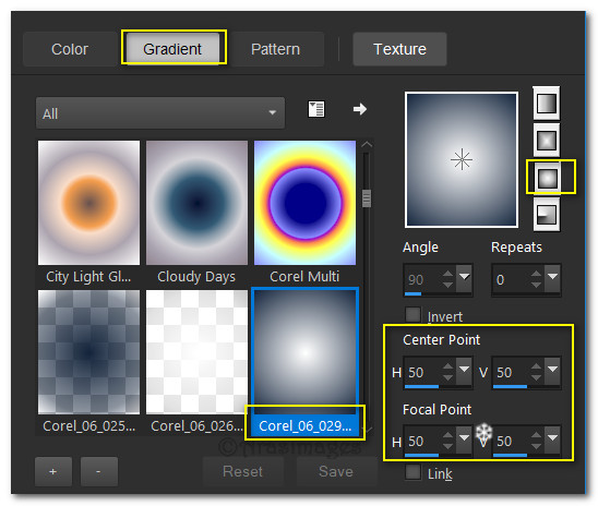 1. In Materials Palette, set Foreground to #ffffff, Background to #071831. In Material Properties, set to Gradient using the foreground/Background colors, Sunburst, Repeats 0, Center Point/Focal Point all to 50. Angle/Invert/Link null.