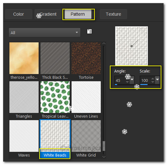 42. Highlight border with Magic Wand. Open the White Beads pattern. Flood fill border with pattern, Angle 45/Scale 100%.